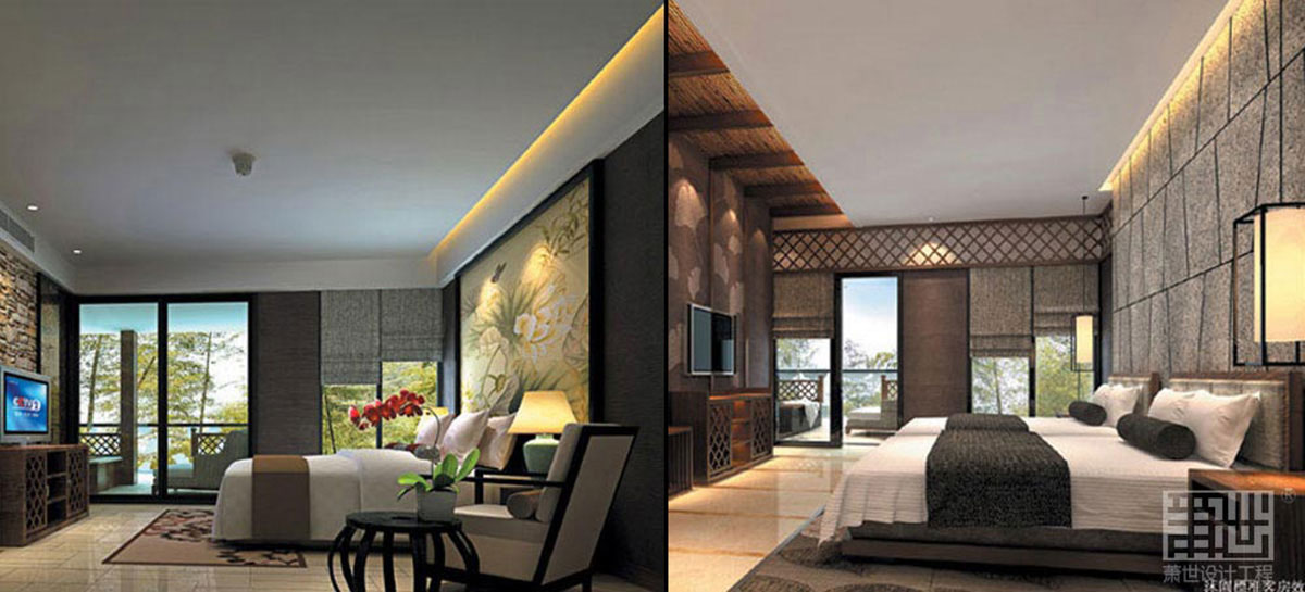 沐園總面積約3760平方米,由入口大廳,休閑廳及各種客房組合。背山面水,且在山頂設(shè)有露天溫泉池。建筑依勢(shì)逐層退臺(tái),與周邊環(huán)境融合共生。室內(nèi)設(shè)計(jì)充分利用建筑結(jié)構(gòu)優(yōu)勢(shì),以“水”、“瓷”為設(shè)計(jì)主題,著力營造輕松舒適的休閑氛圍,并引入新興的“野奢”酒店設(shè)計(jì)理念,強(qiáng)調(diào)原生態(tài)奢享自然概念。入口大堂通過合理空間改造,使原本逼仄的空間顯得開闊的同時(shí)更加與戶外景觀互動(dòng),整面青瓷罐裝飾墻氣勢(shì)不凡,加上入口水景雕及燈飾點(diǎn)綴,整個(gè)空間大氣而不失親和,給人以深刻的第一印象。客房設(shè)計(jì)充分發(fā)揮建筑優(yōu)點(diǎn),針對(duì)不同空間性格由內(nèi)向外逐步布置相關(guān)功能,使內(nèi)外空間有機(jī)過渡,同時(shí)使功能利用率提高,最大程度營造書舒適的休閑環(huán)境,裝飾手法以木、竹、石等本地材料為主,既經(jīng)濟(jì)有展示出本土文化的神韻。山頂露天泡池區(qū)在滿足使用功能的前提下,結(jié)合景觀園林一體化考慮,使客人身在其間最大程度地實(shí)現(xiàn)與自然的融合。